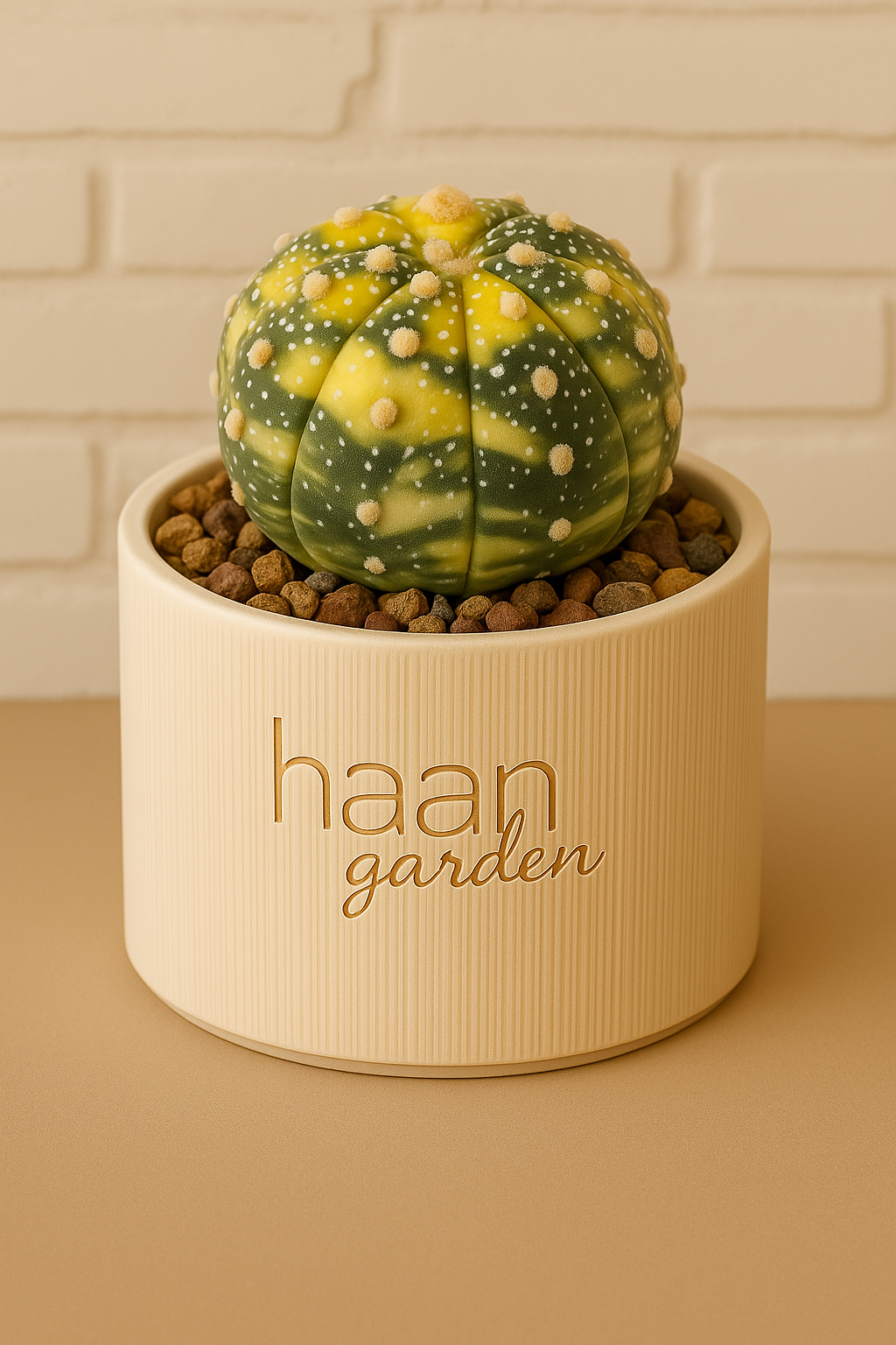 🌈 Nadir Variegata Form: Astrophytum Asterias Variegata, yeşil, sarı, beyaz ve pembe tonlarının harmanlandığı renk geçişli (variegata) yapısıyla koleksiyon değeri yüksek bir kaktüs türüdür.
