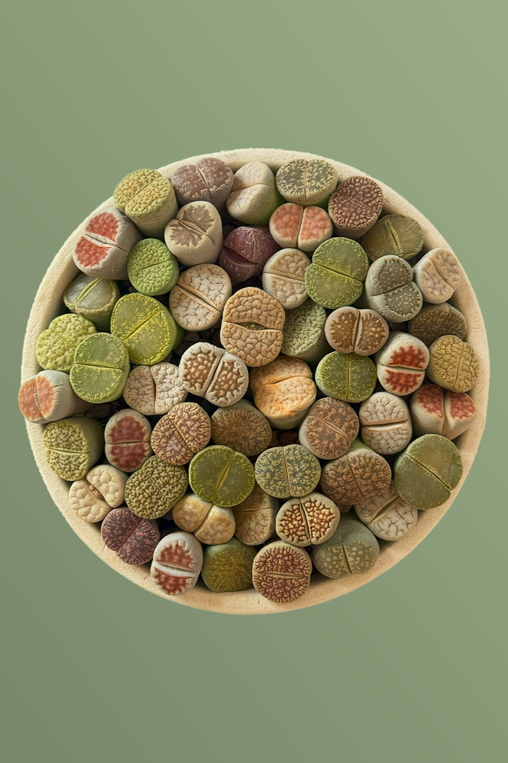 • 🪨 Canlı Taş Görünümü: Lithops Ssp., doğal taşları andıran yapısıyla kamufle olan eşsiz bir sukulent türüdür.