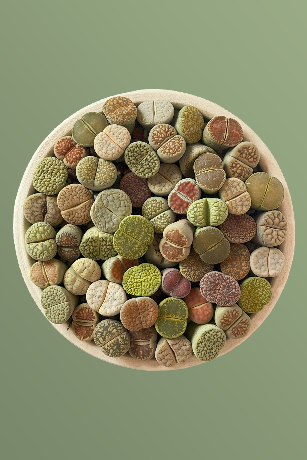 • 🪨 Canlı Taş Görünümü: Lithops Ssp., doğal taşları andıran yapısıyla kamufle olan eşsiz bir sukulent türüdür.
