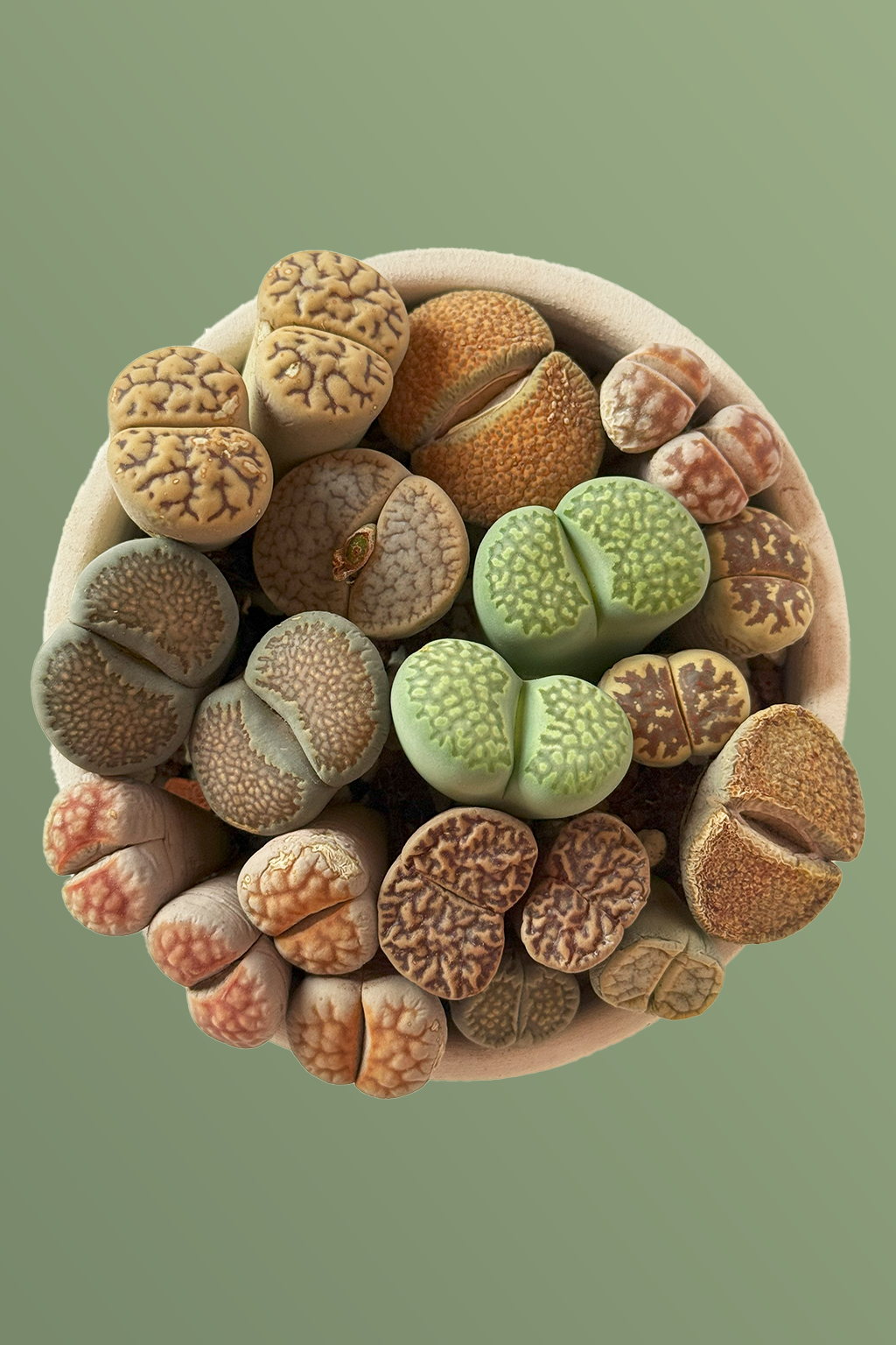 • 🪨 Canlı Taş Görünümü: Lithops Ssp., doğal taşları andıran yapısıyla kamufle olan eşsiz bir sukulent türüdür.
